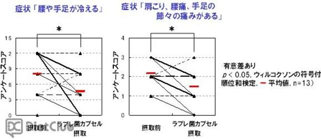 そして、今回、便秘を含む更年期症状を自覚する45~55歳の女性13名を被験者として摂取試験を実施した結果、ラブレ菌の摂取により、便通が改善されることに加え、冷えや肩こり、腰痛などの更年期症状も改善されることを明らかにした。
