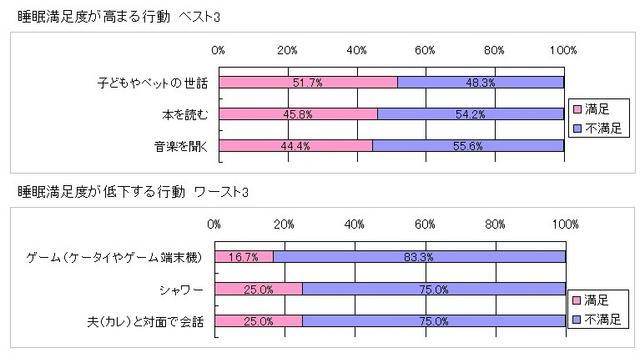 「寝る前の30分」の行動と、睡眠への満足度の関係をみてみると、「子供やペットの世話」をしている人や、「本を読む」人の満足度が高い傾向にあった。一方、最も満足度が低かったのは「ゲーム」という結果になっている。