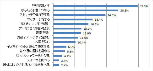 「ぐっすり眠るための行動=眠活」で、意識的に何を実践しているか調べたところ、75パーセントの女性が、睡眠の質を上げるために「眠活」をしており、「特に何もしていない」の25パーセントを上回った。「眠活」として意識的に実践しているのは、「照明を落とす」が最も多く、以下、「ゆっくり浴槽につかる」「ストレッチやヨガをする」など、「温活」や「血めぐり」を意識した行動が多くなっている。