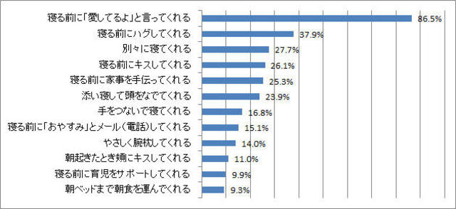 やさしく眠りに誘ってくれるような男性を「グッドナイト(王子)」と定義し、女性が思う「グッドナイト」の条件には、「寝る前に『愛してるよ』と言ってくれる」が86.5パーセントと圧倒的な差で1位。続く第2位は、「寝る前にハグしてくれる」が37.9パーセント。第3位は、「別々に寝てくれる」が27.7パーセントとなった。また、理想の「グッドナイト」を芸能人に例えるとどんな男性なのか聞いたところ、向井理が1位という結果になった。