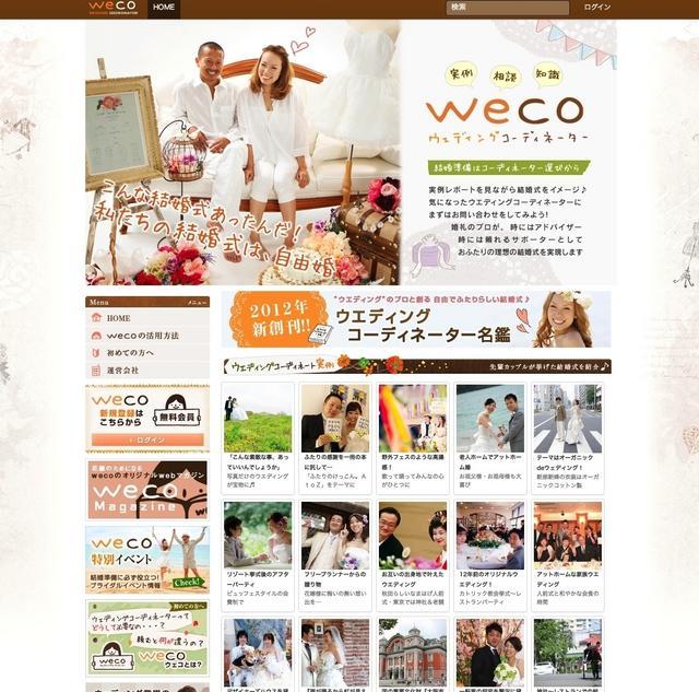 「weco」は、「自由婚」をコンセプトに結婚式を提案する雑誌&WEB。フリーランスの立場で活動する「ウエディングコーディネーター(weco)」と一緒につくった、自由度の高い結婚式の実例紹介を中心に、ウエディングコーディネーターの名鑑を掲載している。これから結婚式の準備を始めるカップルや、既に結婚準備中のカップルに向けて、プロを雇い一緒につくりあげる新しい結婚準備スタイルを提案する。