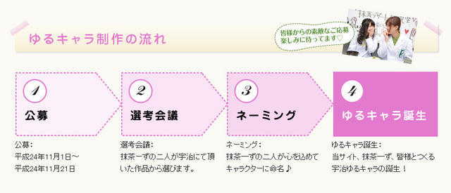 宇治にふさわしい「宇治茶」・「源氏物語」のいずれか(両方でも可)をテーマとしたゆるキャラデザインを募集し、「抹茶ーず」が「宇治茶★大使」として、応募作品からピックアップし、作品と宇治への愛情を込めて命名する。