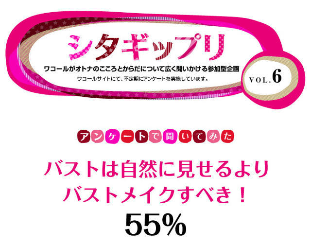 結果は、「バストは自然に見せるよりバストメイクすべき」が55パーセントとなり、「バストメイクすべきでない」をわずかに上回った。