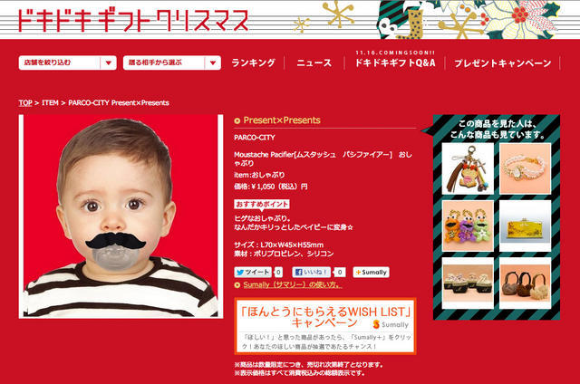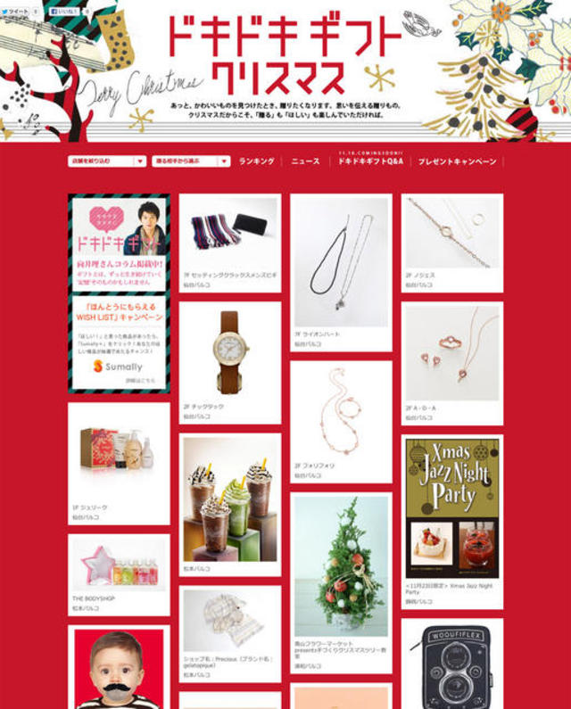全国のパルコの19店舗に、ECサイト「パルコ・シティ」を加えた全20店それぞれがおすすめするクリスマスギフトを、「Sumally」の特設アカウントにラインナップ。パルコの2012年クリスマスキャンペーンテーマ「WISH(願い)」にちなみ、特設アカウントをフォローし、おすすめギフトを「want it」したユーザーの中から抽選で20名様に、「want it」していたアイテムを実際にプレゼントするキャンペーンとなっている。