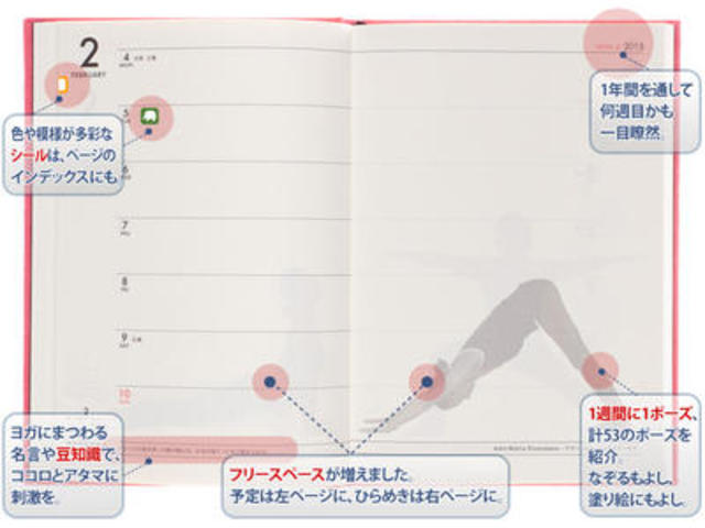 手帳に収録されているコンテンツは、ヨガのポーズ53種をはじめ、ポーズに使われるサンスクリット語集や、ヨガにまつわる名言や豆知識コラムなど。カラーはガネーシャ・イエロー、ラクシュミー・ピンク、シャンティ・ベージュ(2013限定色)の3色で、全国有名ヨガスタジオ・フィットネスクラブ・書店・TOKYOYOGAショップで購入できる。