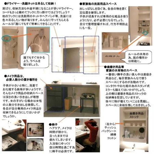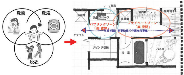 同商品は、平均2畳という狭い洗面空間に、洗面・洗濯・脱衣の3つの機能が集中しているという問題点に着目し、『「美」空間』であるパブリックゾーン(洗面スペース)と、『「楽」空間』であるプライベートゾーン(洗濯・家事、脱衣スペース)を分離した機能的なスペース作りを提案している。「使いたい物がどこにあるかがすぐに分かる」ことを原則とした収納レイアウトを実現した。