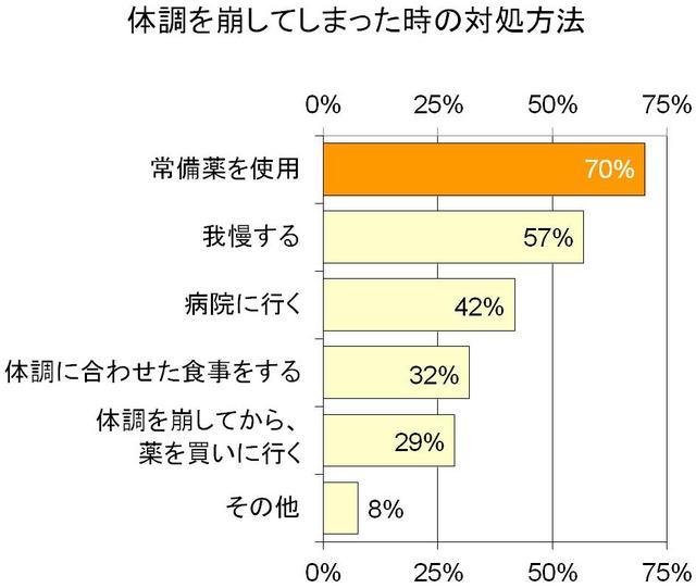 体調を崩してしまった時、どのように対処しているかを複数回答で聞いたところ、70パーセントの人が「常備薬を使用」と答え、最も多かった。体調を崩してしまった時に備えて、しっかりと常備薬を用意している『イマドキ男女』も多いようである。その一方で、次点は「我慢する」(57パーセント)で、「体調を崩してから、薬を買いに行く」という人も29パーセントとなった。