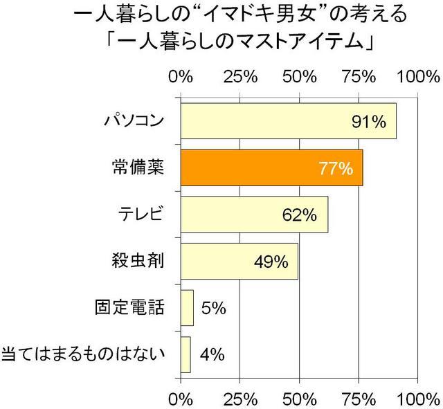 「一人暮らしのマストアイテム」を聞くと、最も多くの人があげたのは「パソコン」(91パーセント)だったが、「常備薬」は、77パーセントの人からの支持を集め、次点に選ばれている。一方で、「必要になった時に自宅になくて、後悔した経験があるもの」を聞いたところ、「常備薬」は、「殺虫剤」と並ぶ1位(いずれも26パーセント)だった。