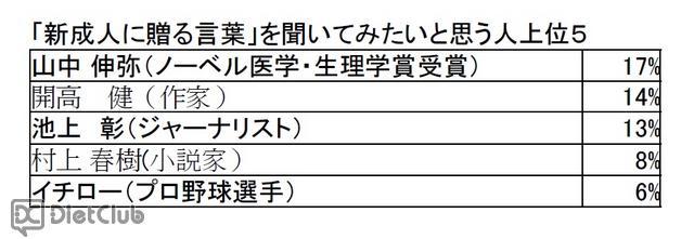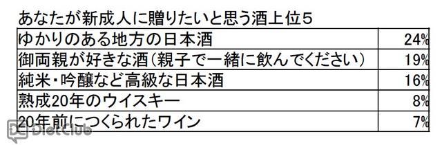 新成人に贈る言葉を聞いてみたい人では、ノーベル賞受賞者の山中伸弥氏、作家の開高健氏、ジャーナリストの池上彰氏、作家の村上春樹氏などが多くの支持を集めた。新成人に贈りたいお酒では、1位に「ゆかりのある地方の日本酒」、2位に「両親が好きなお酒」と続き、メッセージ性のあるお酒が好まれる傾向にある。また、20年熟成のウイスキー、20年前のビンテージのワインなど20年にこだわったお酒も上位にランクインした。