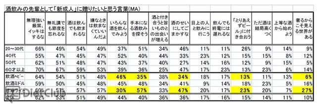 選択肢にあげた以外にも「自分の飲める限界を知れ。男は恥をかかないために、女は節操を守るために」(50代・女性)、「ネットや仲間内に留まってないで、外で渋めに酔ってみな」(40代・男性)、「酒好きなご両親なら一緒にぜひ一緒に飲むことを勧めます」(30代・女性)などの提言が集まった。