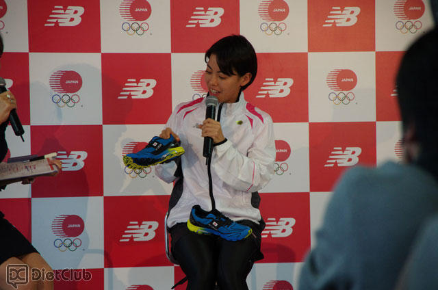 調印式の後には、同社と12年もの付き合いになるという、トライアスロンの上田藍選手が登場。ロンドン五輪時に名前入りのシューズをはじめて作ってもらったという上田選手は、そのシューズを片手に「足が細く、なかなかフィットするシューズが無かった当時、ニューバランスのシューズはフィットするシューズが選べる環境にあった」と同社のシューズを履くことになったきっかけを語った。昔に比べて今は色々なシューズ展開があり、選べる楽しさもあるので、一般の方でもスポーツに通じやすい環境にあると話した。
