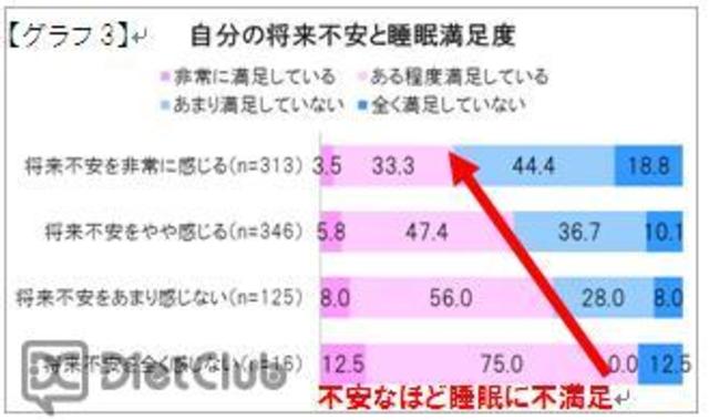 自身の将来に「不安」を感じている人が全体の約8割で、そのうち約6割の人が「睡眠」に満足していないことが分かった。更に、将来不安の気持ちが強いほど、睡眠満足度が低下する傾向にあることが明らかになった。