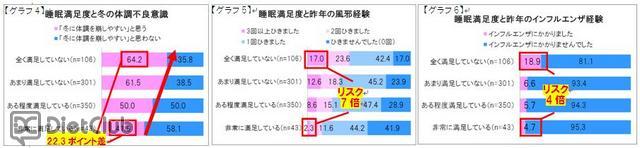 「不安」などのストレスは、睡眠の質を低下させ、睡眠の質が低下すると「成長ホルモン」の分泌が十分に行われなくなるため、「免疫力」も低下し、その結果、風邪をひいたり細菌やウィルスにも感染しやすくなってしまうという。また、睡眠に不満足な人のほうが、冬に体調を崩しやすいと思う傾向になっていることが分かった。