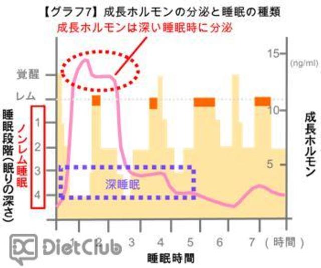 スリープクリニック調布院長・遠藤拓郎氏によると、「成長ホルモン」の主な役割は、免疫物質を生成したり、古くなった細胞を作り替えたり、健康な身体づくりには欠かせない物質と言え、また、成長ホルモンの分泌は、「眠りはじめの3時間」に集中しているという。「成長ホルモン」の十分な分泌のためには、最も眠りの深い「深睡眠(しんすいみん)」を取ることが大切で、深睡眠を得るためには、就寝前にしっかりと体温を上げることが重要とコメントしている。
