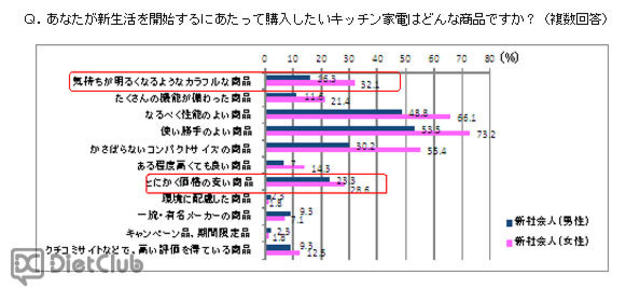 また、新社会人女性に、キッチン家電購入時にポイントとする点を聞いたところ、使い勝手(73.2パーセント)や性能(66.1パーセント)、コンパクトなサイズ(55.4パーセント)の次に「カラフルな商品」(32.1パーセント)を購入したいという結果となった。