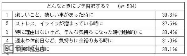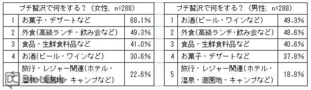 男性のプチ贅沢トップは49.3パーセントで「お酒」、女性のトップは68.1パーセントで「お菓子」、2位は男女ともに「外食」(男性48.6パーセント、女性49.3パーセント)となった。プチ贅沢をする理由のトップは「楽しいことがあったとき」が39.6パーセント、2位は「ストレスがたまったとき」の37.5パーセントとなり、する理由にはポジティブ型とストレス発散型の2種類が上位となった。