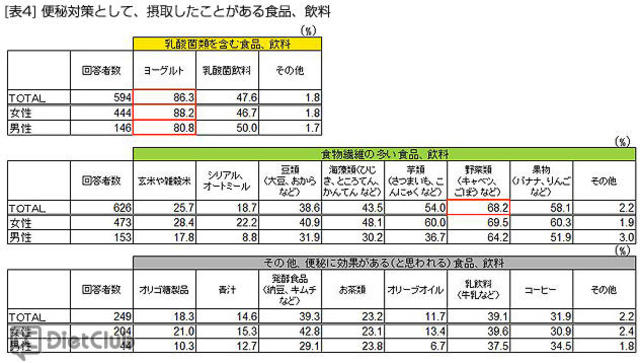 便秘対策に摂取したことがある食品の内容を具体的に聞いたところ、「乳酸菌を含む食品・飲料」と回答した人ではヨーグルトが最も高く、女性の88.2パーセント、男性でも80.8パーセントと多くの人が摂取している。「食物繊維の多い食品、飲料」と回答した人では、野菜類(キャベツ、ごぼうなど)が最も高く、68.2パーセントだった。