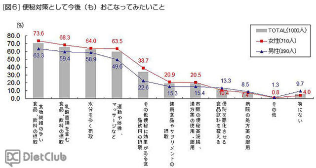 今後行ってみたい便秘対策としても「食物繊維の多い食品、飲料の摂取」の支持は高く、女性は73.6パーセント、男性で63.3パーセントとなっている。次いで、「乳酸菌類を含む食品、飲料の摂取」は女性で68.3パーセントとなり、女性においては食品、飲料の摂取が約7割の支持を集めた。