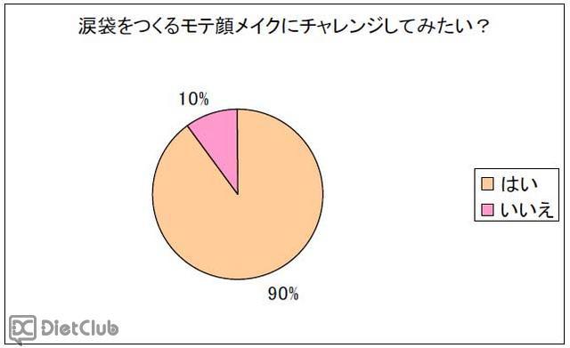 同社がアンケートを行った結果によると、「涙袋をつくるモテ顔メイクにチャレンジしてみたい?」という質問では、「はい」が90パーセント、「いいえ」が10パーセントという結果になり、涙袋をメイクで作ってみたいと思っている人が多いことがわかった。