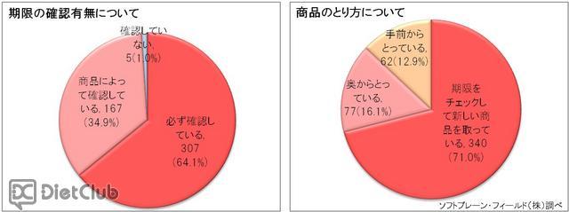 食品の期限表示である消費期限と賞味期限(品質保持期限)の違いに関しては、「違いを説明できる」が44.5パーセント、「なんとなく知っている」は50.3パーセントだった。購入時に食品期限を確認している割合は、「必ず確認している」が64.1パーセント、「商品によって確認している」は34.9パーセントとなった。また、商品の取り方については、「期限をチェックして新しい商品をとっている」は71.0パーセント、「奥からとっている」16.1パーセント、「手前からとっている」12.9パーセントで、多くの人は新しい商品を選んで取っていると考えられる。