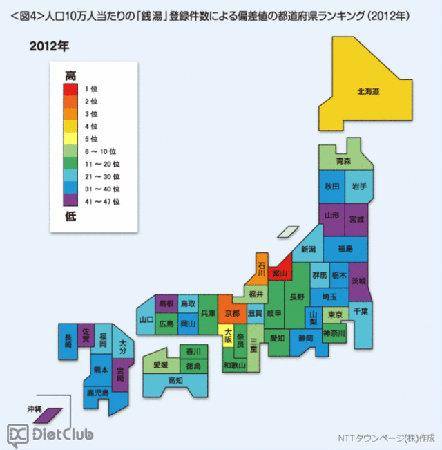 NTTタウンページは、同社が運営する販促・マーケティング支援サイト「TPDB.jp」にて、「温泉・銭湯」都道府県ランキングを発表した。