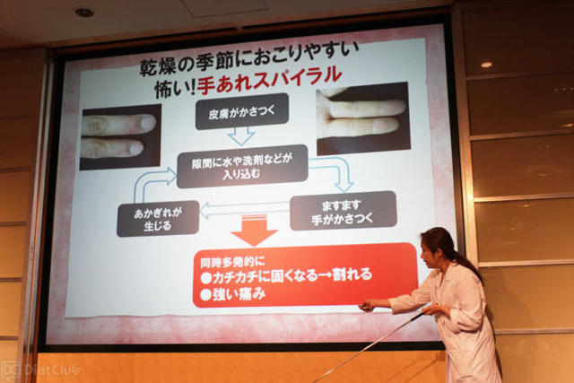 また、野村皮膚科医院院長の野村有子先生は「秋冬におこりやすい肌荒れと正しいケア方法」について、手あれが手あれを呼ぶ「手あれスパイラル」を中心に解説。「手あれスパイラル」脱出のためのハンドケアとして、