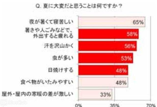 また『夏に大変だと思うことは何ですか?』という質問に対し「夜が暑くて寝苦しい」(65%)、「暑さや人ごみなどで、外出すると疲れる」(58%)、「汗をたくさんかく」(56%)、「虫が多い」(53%)、「日焼けする」(48%)などの回答があった。この結果は“外出”への抵抗感の高さを表していると言えそうだ。