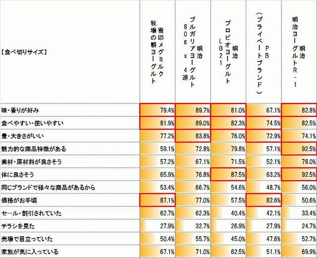 食べ切りサイズで上位にランクインした商品の購入理由は、『牧場の朝ヨーグルト(雪印メグミルク)』が「価格がお手頃(87.1%)」、「食べやすい・使いやすい(81.9%)」、「味・香りが好み(79.4%)」だった。『ブルガリアヨーグルト 80gx4連(明治)』は「味・香りが好み(89.7%)」、「食べやすい・使いやすい(89.0%)」、「量・大きさがいい(83.8%)」となり、『プロビオヨーグルトLG21(明治)』は「体に良さそう(87.5%)」、「食べやすい・使いやすい(82.3%)」、「味・香りが好み(81.0%)」という結果だった。