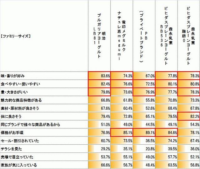 ここで、ヨーグルトのファミリーサイズと食べ切りサイズで購入者が多かったブランドごとに、購入理由を調査した。その結果、ファミリーサイズの『ブルガリアヨーグルトLB81(明治)』では「味・香りが好み(83.6%)」、「食べやすい・使いやすい(82.4%)」、「量・大きさがいい(79.8%)」の順となった。『ナチュレ恵megumi(雪印メグミルク)』は「価格がお手頃(85.1%)」、「食べやすい・使いやすい(76.6%)」、「味・香りが好み(74.3%)」となり、『PB(プライベートブランド)』は「価格がお手頃(89.1%)」、「量・大きさがいい(76.9%)」、「食べやすい・使いやすい(72.5%)」となった。