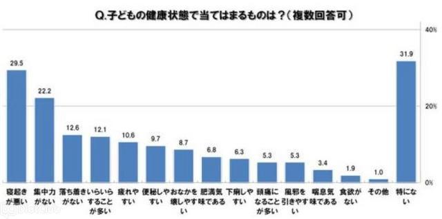 続いて、『子どもの健康状態で当てはまるものは?』という問いでは、「寝起きが悪い」が29.5%でもっとも多く、次に「集中力がない」(22.2%)、「落ち着きがない」(12.6%)、「いらいらすることが多い」と続き、全体で68.1%の母親が子どもの健康・生活状態に何かしら不安を抱えているということが明らかになった。