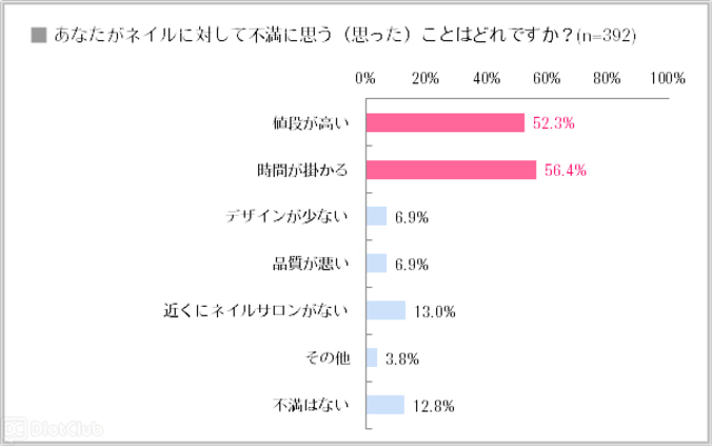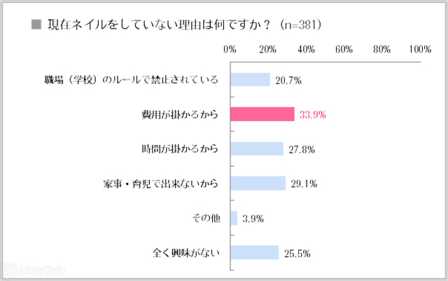 ネイル経験者を対象に「ネイルに対する不満」を聞いたところ、「時間が掛かる」が56.4%でもっとも多く、次いで「値段が高い」が52.3%という結果に。一方、現在ネイルをしていない人を対象に「ネイルをしていない理由」を聞いたところ、「費用が掛かる」が33.9%、「時間が掛かる」が27.8%だった。ネイルをしたい気持ちはあるができない理由として、「職場(学校)で禁止されている」が20.7%、「家事・育児で出来ない」が29.1%だった。