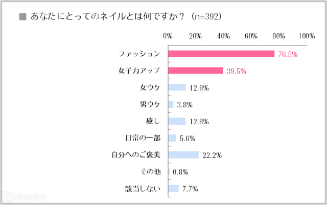 また、ネイル経験者を対象に「あなたにとってのネイルとは何ですか?」という問いに対して、「ファッション」が76.5%でもっとも多く、次いで「女子力アップ」が39.5%、「自分へのご褒美」が22.2%と続いた。しかし「男ウケ」は3.8%と非常に低かった。