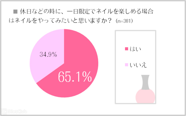 現在ネイルをしておらず、明確な不満のある人を対象に「ネイルをしていない理由が解消されたらネイルをしたいか」を聞くと、「はい」と答えた人が76.6%でネイルをしたい気持ちが高いことがわかった。また、現在ネイルをしていない人を対象に「休日限定ネイルをしたいか?」と聞いたところ65.1%の人が「はい」と回答している。