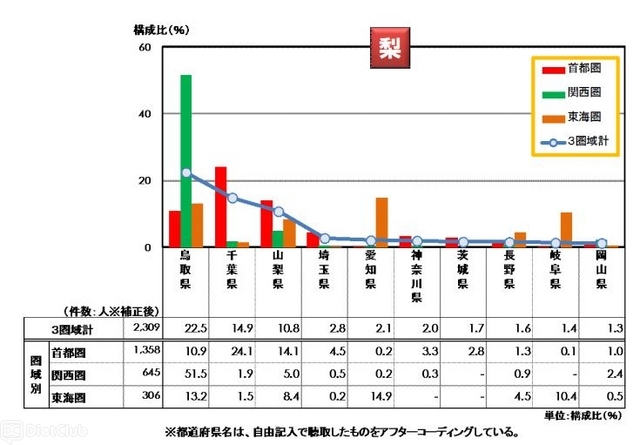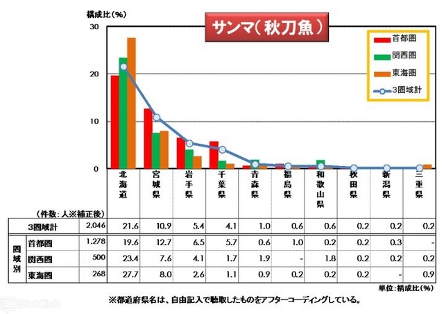 秋の味覚で代表的な水産品、農産品の計24品目について、喫食意向を調査したところ、3圏域計で最多は「サンマ」が77.0%だった。水産品ではサンマに次いで「サケ」、「カツオ」が2位と3位に、農産品では「梨」が67.5%の最多支持を集め、次いで「ぶどう」「秋ナス」が2位、3位だった。
