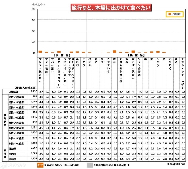 「本場に出かけて食べたい」ものについては、全体に割合が低いため順位は参考程度だが、3圏域合計では、「松茸」が全体1位、2位に「新そば」、3位は「サンマ」という結果だった。春・夏・冬の同一の設問では水産品が強い傾向であったが、秋の味覚に関しては水産品と農産品とでそれほど大きな差がない結果となっている。