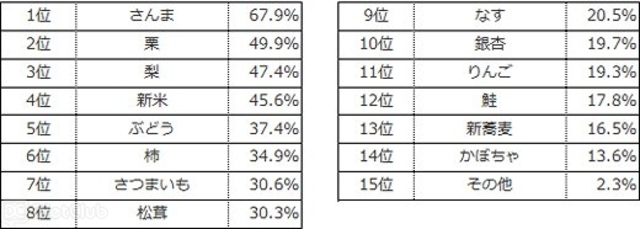 また、秋になると食べたくなるものについて調査した。1位は「さんま(67.9%)」で半数以上の人が支持している。2位は「栗(49.9%)」、3位は「梨(47.4%)」という結果になった。