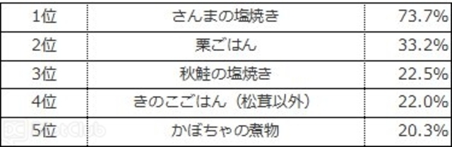 秋になると必ず食べる(または作る)料理について尋ねると、「さんまの塩焼き」が2位に2倍以上の差をつけて、73.7%で1位にランクインした。2位は「栗ごはん(33.2%)」、3位は「秋鮭の塩焼き(22.5%)」と、秋の食卓の定番メニューがランクインしている。4位には「松茸以外のきのこごはん(22.0%)」が入った。なお、「松茸ごはん(19.5%)」は7位だった。