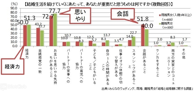 このほか、『結婚生活を続けていくにあたって、あなたが重要だと思うものは何ですか』という質問では、既婚者の1位が「お互いを思いやる気持ちがあること(74.3%)」、2位は「会話があること(51.8%)」、3位「経済力(50.0%)」という結果に。離婚者は、1位「お互いを思いやる気持ちがあること(77.3%)」、2位」 「経済力(51.3%)」 、3位「会話があること(40.0%)」という結果になった。