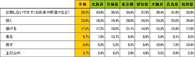 今回調査した7都道府県(北海道・宮城県・東京都・愛知県・大阪府・広島県・福岡県)別に見ると、「焼く」と答えた方はどの都道府県でも9割を超えているが、全体で2位の「煮る」に関しては、北海道が37.8%でトップ。もっとも低かったのは愛知県で8.5%と3割近くの差があった。