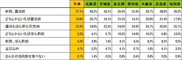 次に、「さんまの塩焼き」にかける調味料にスポットを当てた。全体では、「断然、醤油派」が37.1%で1位。「醤油もぽん酢も両方OK」が22.9%で2位となり、「どちらかといえば醤油派」が18.9%で3位だった。「断然、醤油派」と「どちらかといえば醤油派」を合わせると56.0%となり、「さんまの塩焼き」は醤油で食べる方が半数以上を占める結果となった。