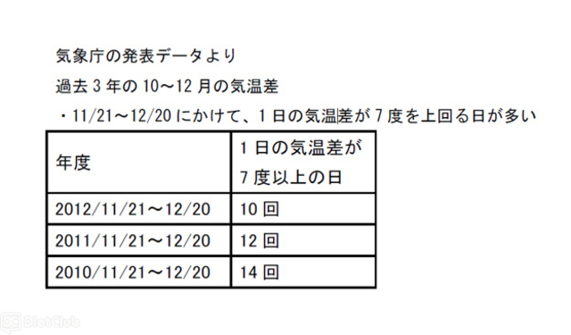 気象庁の発表データで過去3年の10~12月を調べてみると、11月21日~12月20日にかけて、1日の気温差が7度以上を上回る日が多いことがわかる。
