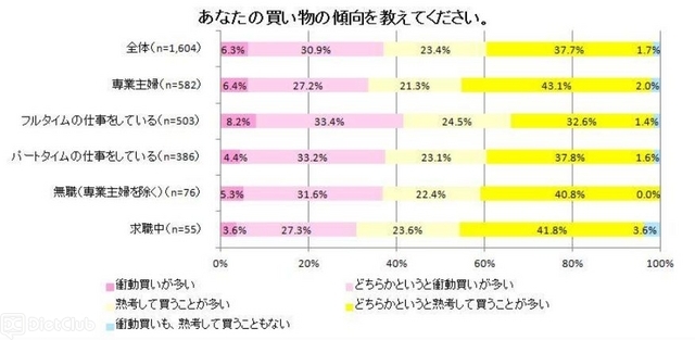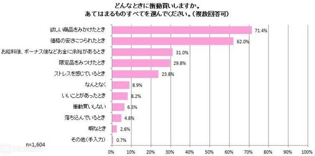 このほか、『どんなときに衝動買いをしますか』という問いでトップだったのは、「欲しい商品をみかけたとき」(71.4%)。次いで、「価格の安さにつられたとき」(62.0%)、「お給料後、ボーナス後などお金に余裕があるとき」(31.0%)、「限定品をみつけたとき」(29.8%)、「ストレスを感じているとき」(23.8%)という順だった。
