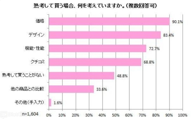 また、同調査で、『熟考して買う場合、何を考えていますか』という問いでは、90.1%の人が「価格」と回答。その他としては、「デザイン」(83.4%)、「機能・性能」(72.7%)、「クチコミ」(68.8%)が購入時のポイントになっていることがわった。