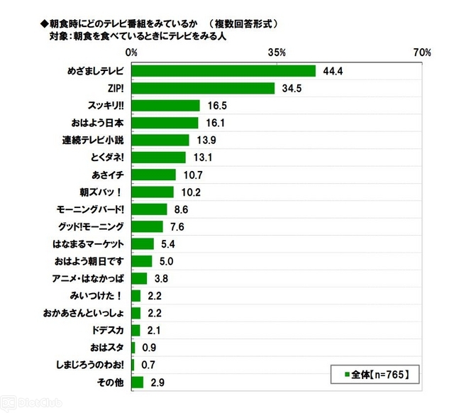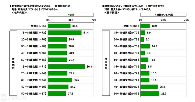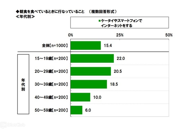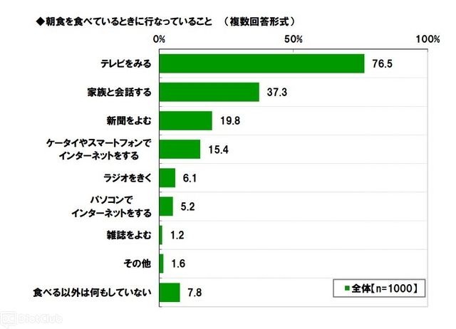 このほか、『朝食を食べているときに行なっていること』を聞いたところ、「テレビをみる」(76.5%)が際立って高く、「家族と会話する」(37.3%)、「新聞をよむ」(19.8%)、「ケータイやスマートフォンでインターネットをする」(15.4%)が続いた。