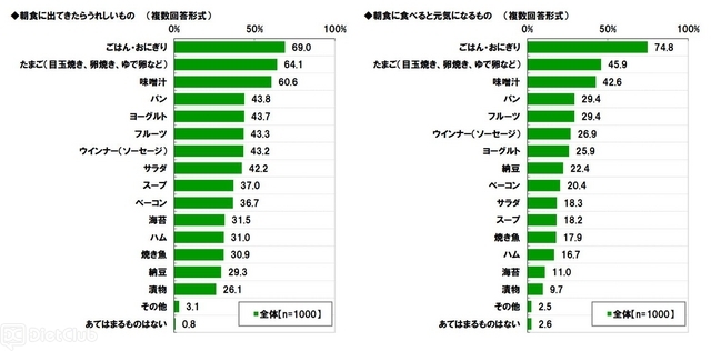 続いて、『朝食に出てきたらうれしいもの』を聞くと、1位は「ごはん・おにぎり」(69.0%)、2位は「たまご(目玉焼き、卵焼き、ゆで卵など)」(64.1%)、3位は「味噌汁」(60.6%)という結果に。