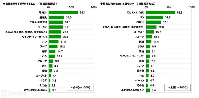 また、『食欲をそそる香りがするもの』でトップだったのは「味噌汁」(64.4%)となり、以降は、「焼き魚」(34.0%)、「ごはん・おにぎり」(31.6%)だった。