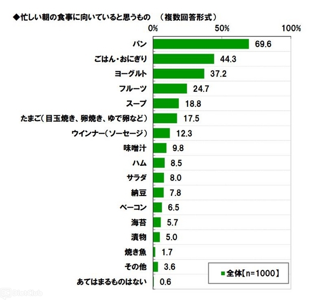 同調査で、『朝食の主食で、もっともよく食べるもの』を尋ねたところ「ごはん類」が47.1%で1位となり、2位は「パン類」で45.0%だった。