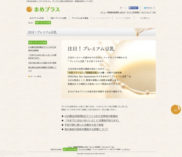 主なコンテンツは、「まめプラスな生活」、「注目!プレミアム豆乳」、「プレミアムなまめ商品」、「専門家・料理家によるインタビュー」の4つ。