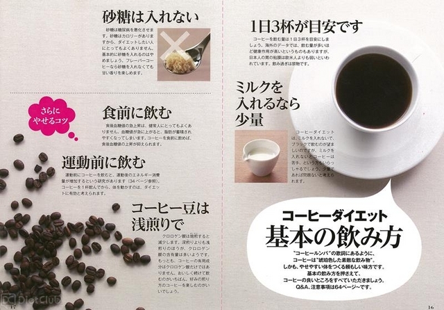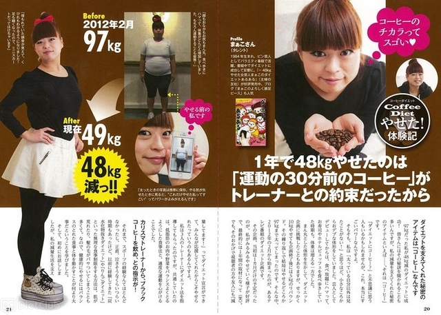 同書で成功談として取り上げられている芸人・まぁこは、97kgだった体重を1年間かけて49kgまで減らしており、運動と食事法に加えて、トレーナーの指示により運動の30分前にコーヒーを飲むことで脂肪を燃えやすい状態にしていたことがダイエットを成功に導いたという。40代の主婦は、甘いおやつの変わりに「フレーバーコーヒー」を飲むことで、ひと夏で5kgの減量に成功している。