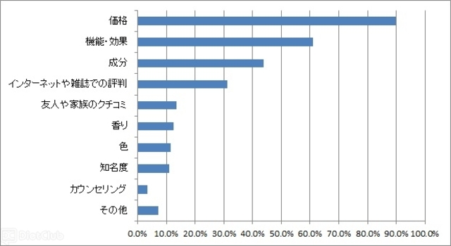 更に、消費税アップを機に「化粧品を切り替える」と答えた女性を対象に、切り替える際に重視するポイントを聞いて見たところ、1位は「価格」(89.9%)だったが、続く「機能・効果」「成分」も、それぞれ61.1%、43.8%と高い結果になっている。そして、知名度よりも、インターネットや雑誌での評判を重視していることが明らかになった。